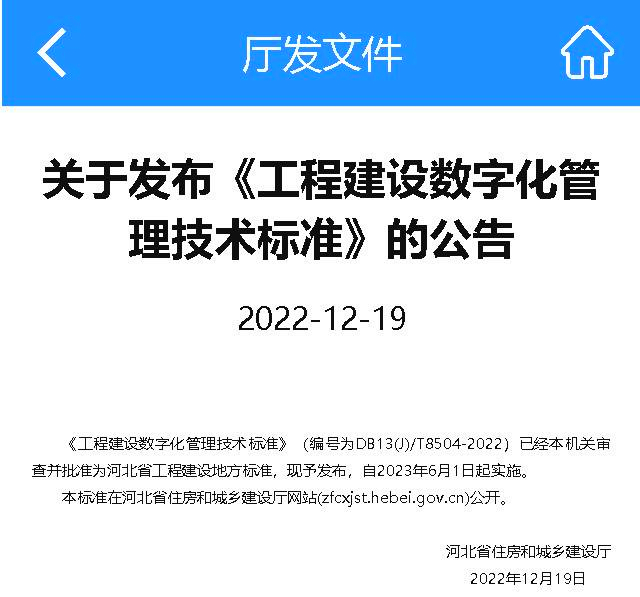 2022年12月19日,由河北省建筑科學(xué)研究院有限公司、河北省住房和城鄉(xiāng)建設(shè)廳信息宣傳與檔案中心和北方工程設(shè)計(jì)研究院有限公司共同主編的《工程建設(shè)數(shù)字化管理技術(shù)標(biāo)準(zhǔn)》(編號為DB13(J)/T8504-2022)已經(jīng)河北省住房和城鄉(xiāng)建設(shè)廳審查并批準(zhǔn)為河北省工程建設(shè)地方標(biāo)準(zhǔn),自2023年6月1日起實(shí)施。